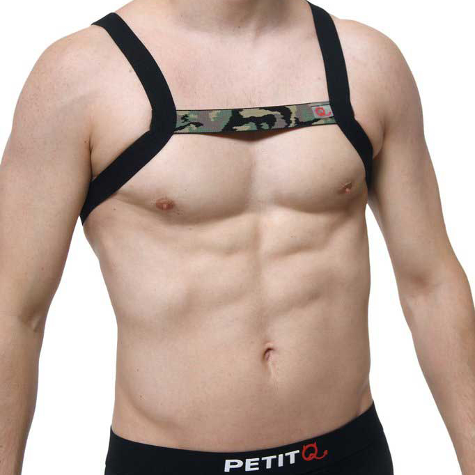 Confeccionado con la durabilidad del poliéster, este arnés presenta un diseño elástico en la parte frontal sobre el pecho, con un patrón de camuflaje que añade un toque táctico y atrevido.