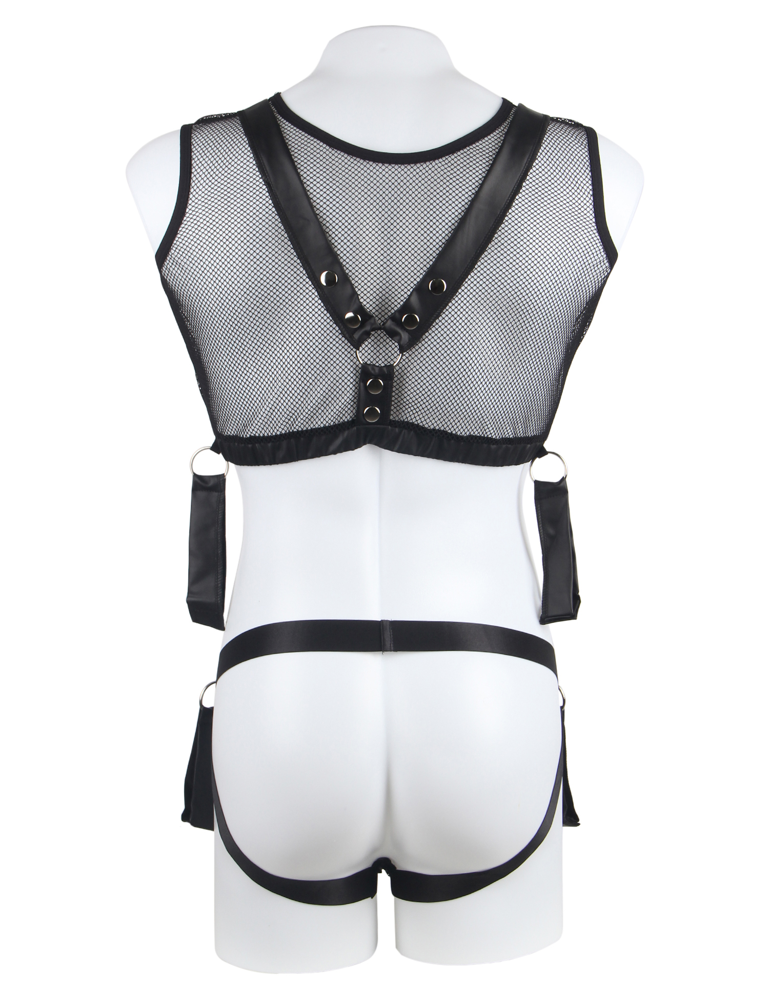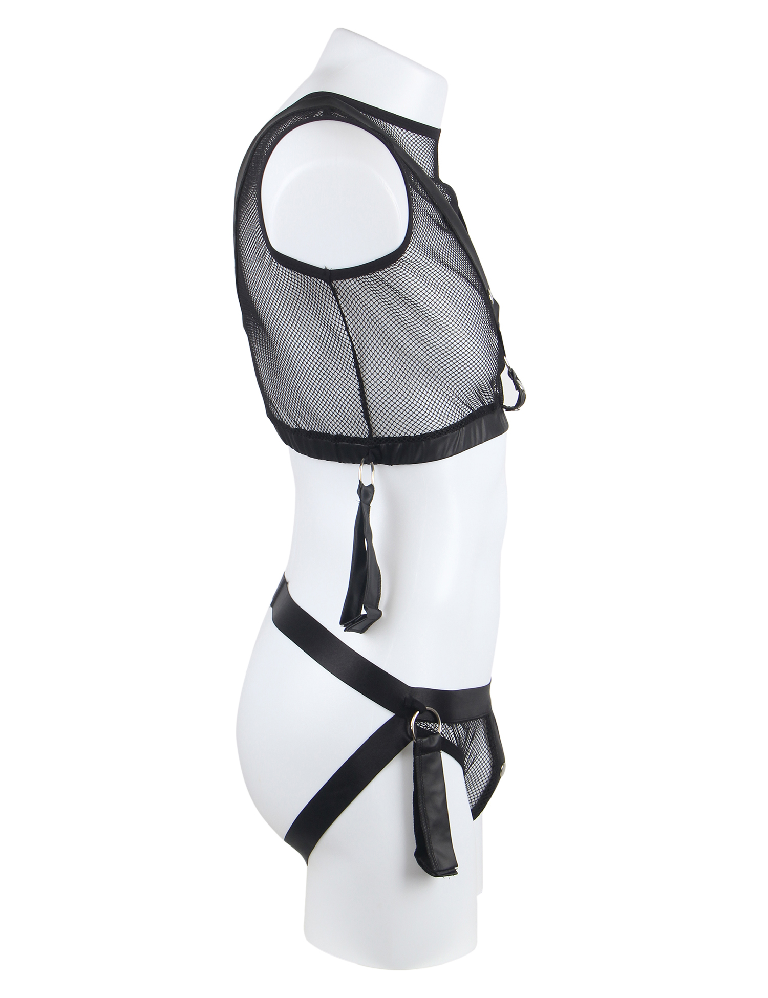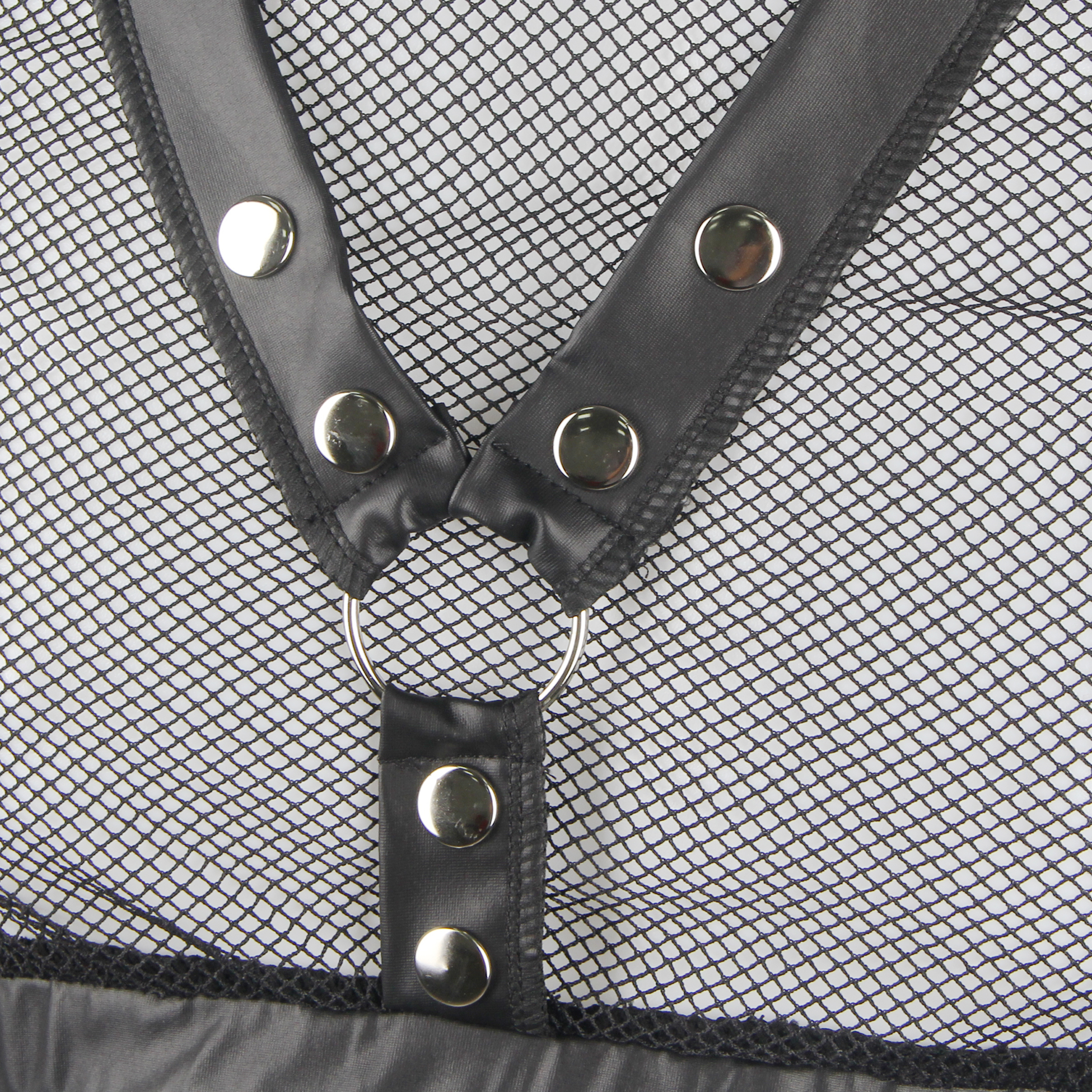 Un top corto y un suspensorio con espalda abierta confeccionados con una red suave y elástica con detalles de apariencia mate. La parte superior tiene un arnés cosido de forma segura. El suspensorio se puede abrir gracias a los prácticos botones de presión de la bolsa. Ambas partes tienen un anillo a cada lado para que los 4 sujetadores blandos incluidos se puedan unir al conjunto. Los sistemas de sujeción tienen cierres de velcro ajustables y se pueden enganchar a las anillas de la parte superior y al suspensorio con sus pequeños cierres.