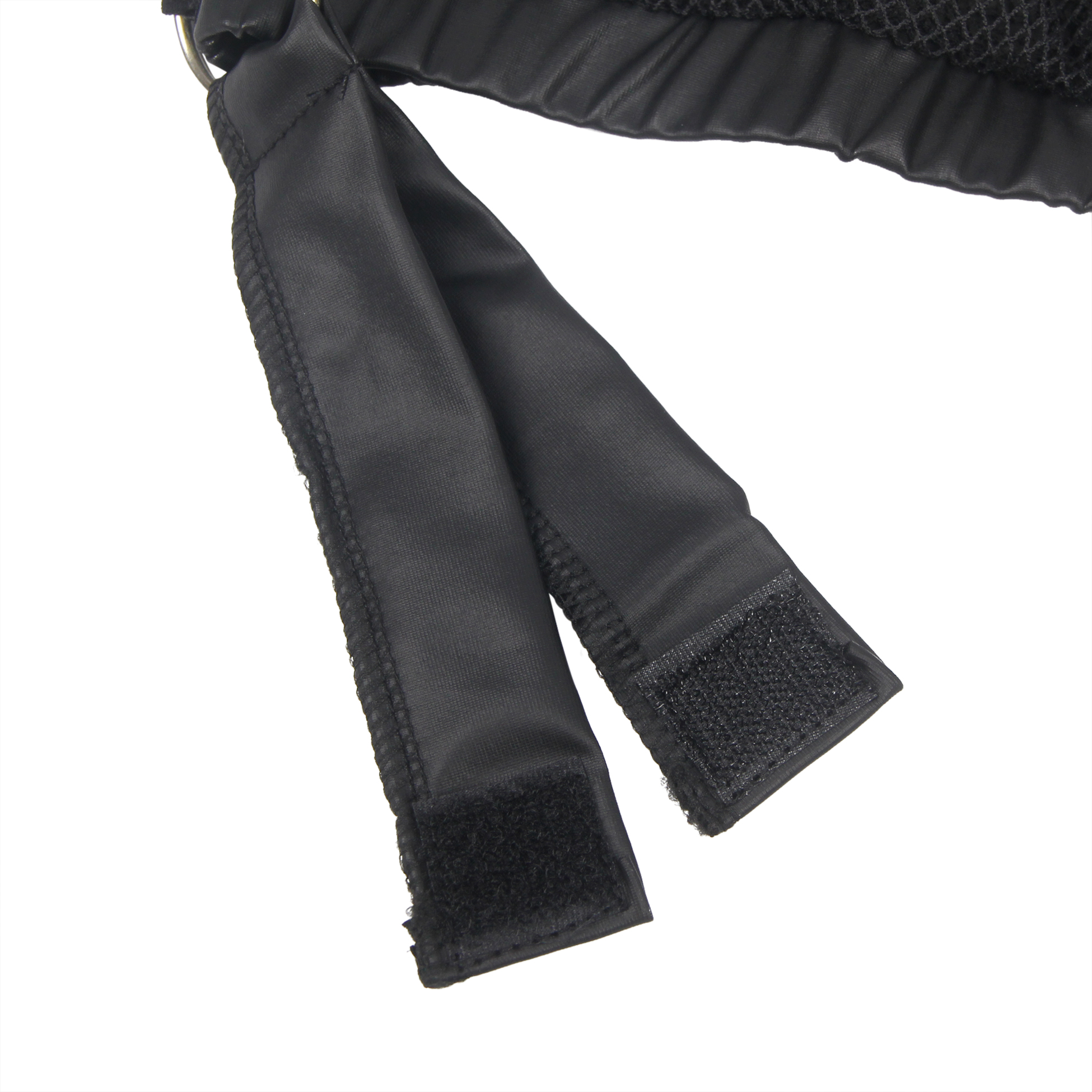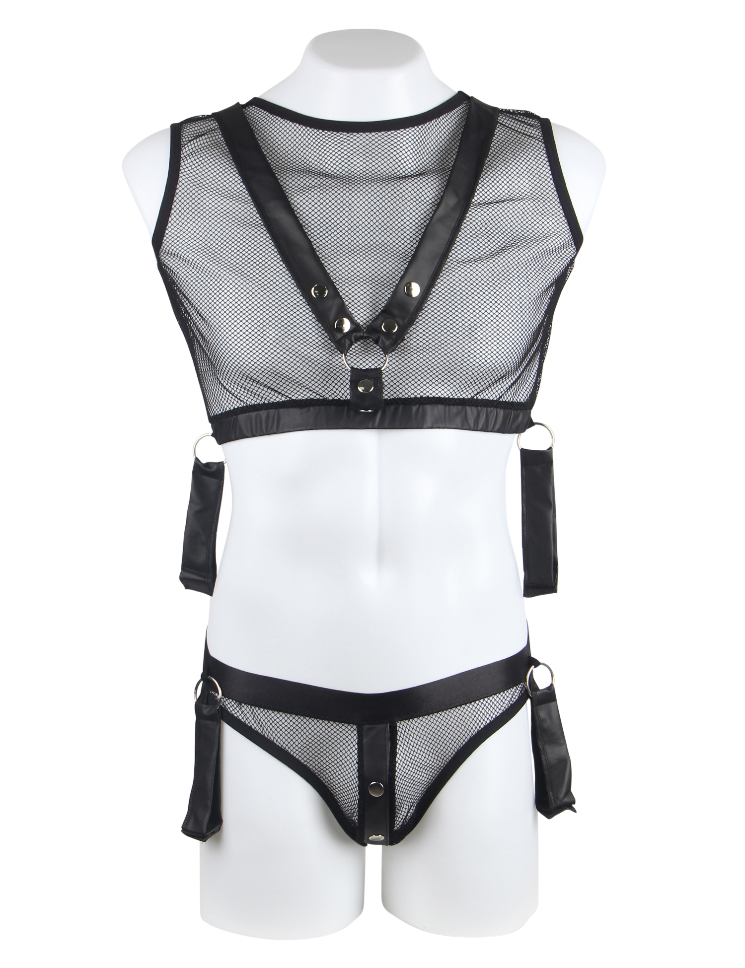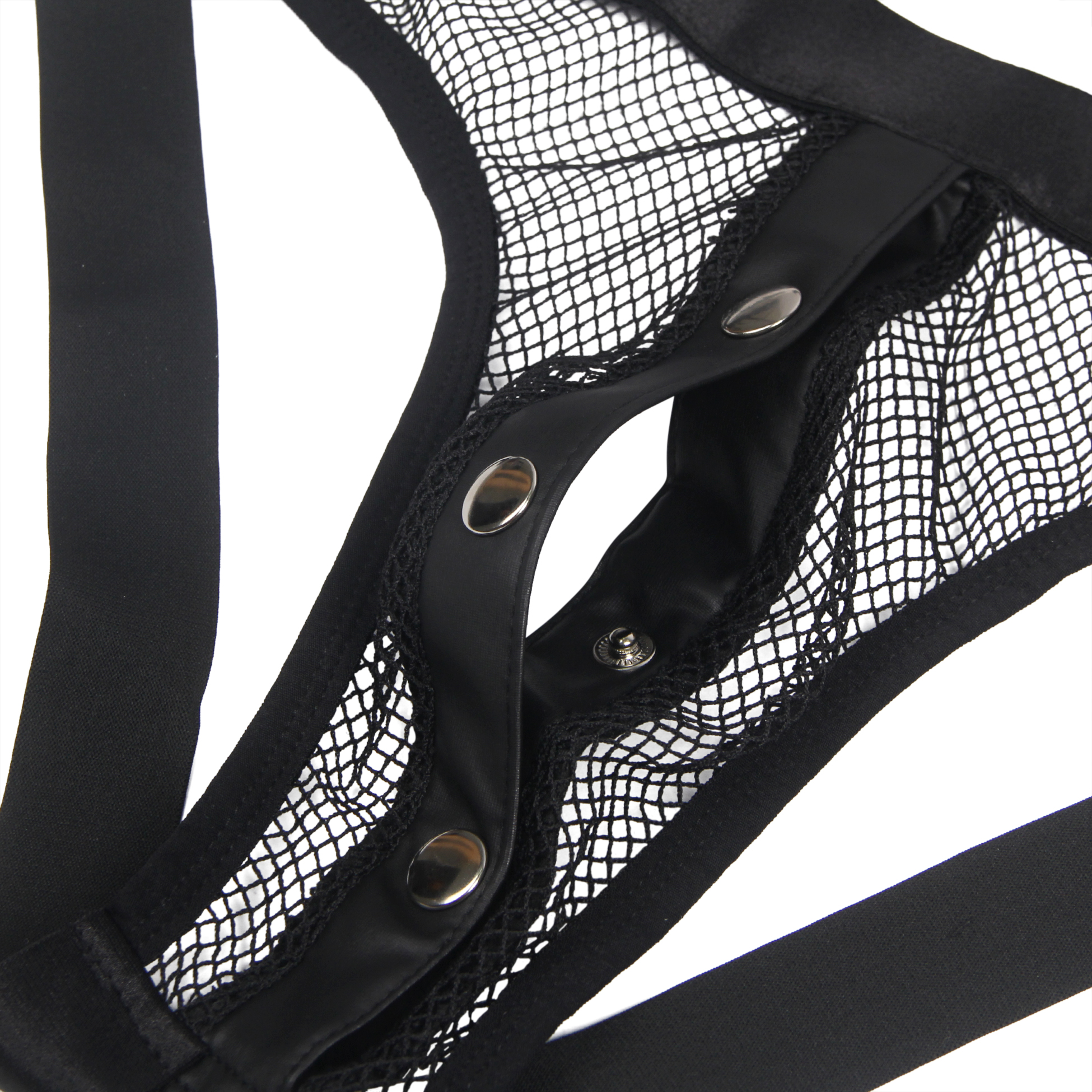 Un top corto y un suspensorio con espalda abierta confeccionados con una red suave y elástica con detalles de apariencia mate. La parte superior tiene un arnés cosido de forma segura. El suspensorio se puede abrir gracias a los prácticos botones de presión de la bolsa. Ambas partes tienen un anillo a cada lado para que los 4 sujetadores blandos incluidos se puedan unir al conjunto. Los sistemas de sujeción tienen cierres de velcro ajustables y se pueden enganchar a las anillas de la parte superior y al suspensorio con sus pequeños cierres.