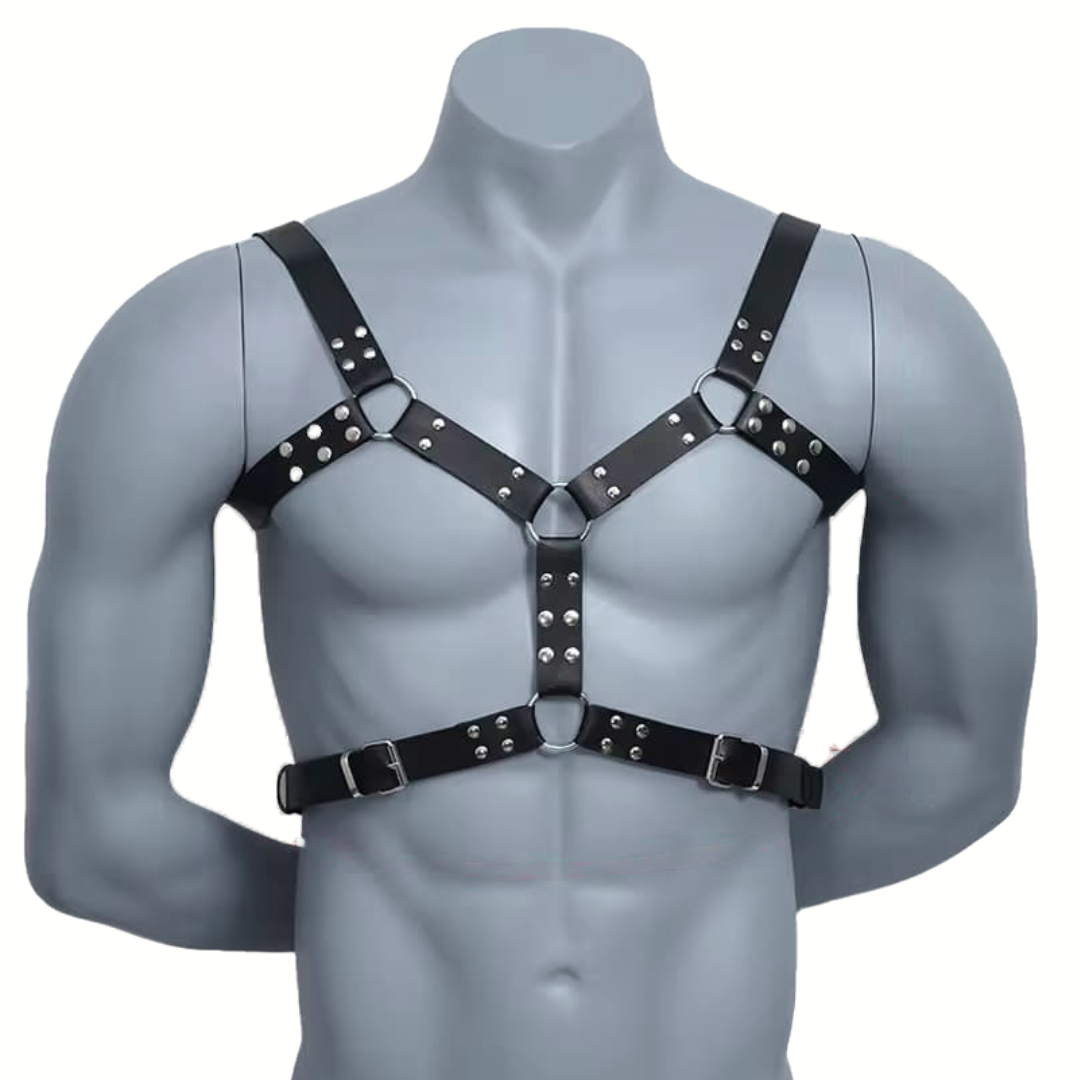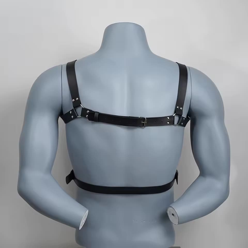 Arnés de tipo Y que cubre con autoridad tanto la parte superior como inferior del pecho, creando una silueta fuerte, estructurada y muy masculina. Su diseño con tres anillos al frente realza el torso y crea una estética de poder y resistencia, perfecta para quienes quieren lucir y sentirse como verdaderos emperadores del deseo.