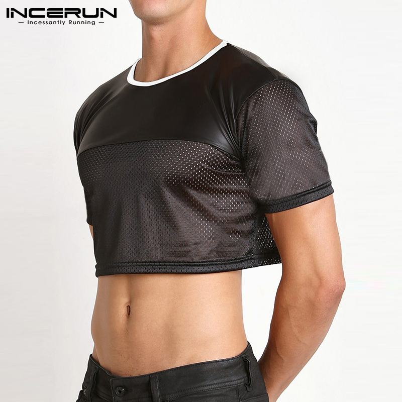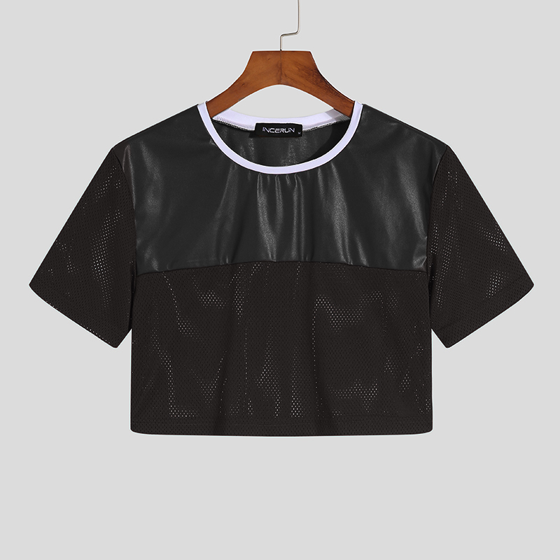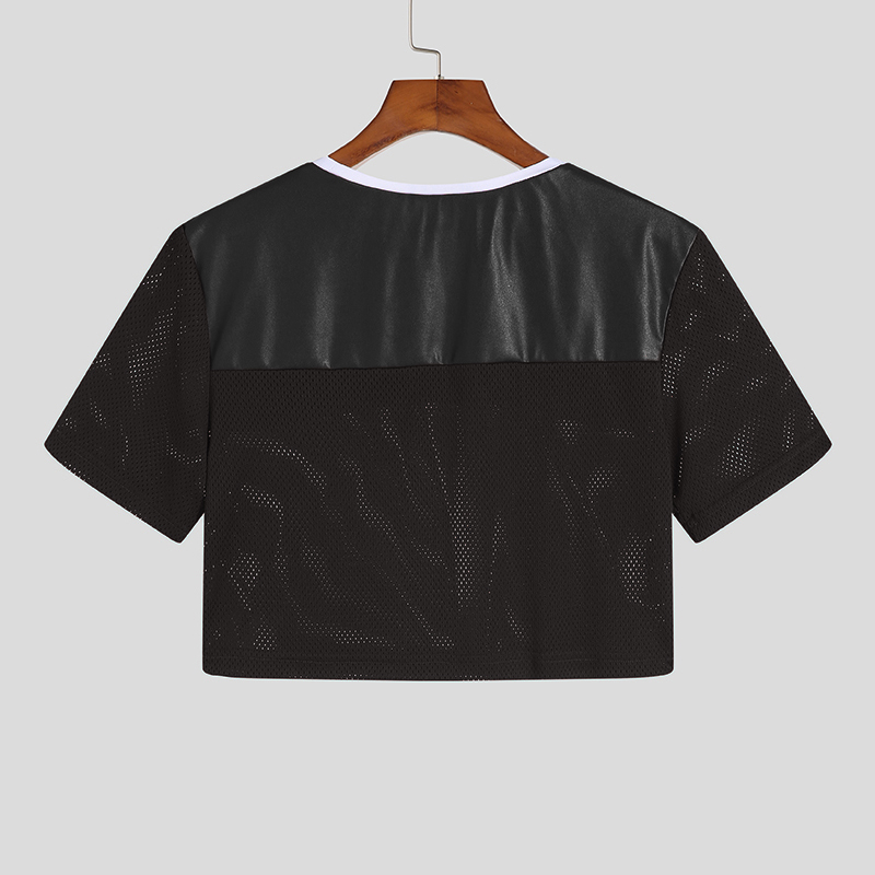 Siente la energía y la rebeldía con el Crop Top INCERUN Fevercity, una prenda única que combina la audacia del cuero sintético en la parte superior con la frescura del poliéster microperforado en las mangas y el torso.